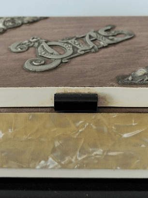 Antigo estojo em cartão, para comunhão. Composto de três peças em couro marron com gravação dourada, sendo uma carteira, porta terço com pedras na cor coral e um missal " nouveau Missel Romain " Turnhout (Bélgica).